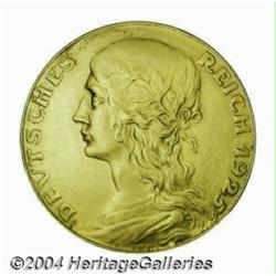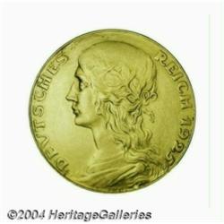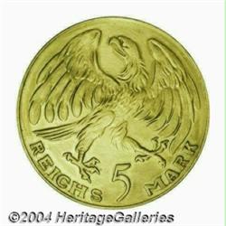 Goetz 5 mark pattern in gold 1925, Bust left/Eagle, Schaff-331G2, Vs.3, Rs.1, XF with brush marks and evidence of damage in the field by the S of DEUTSCHES. Very Rare with only a handful of pieces known. Important notice: Heritage usually auctions material at the rate of 200-250 lots per hour. On some occasions eBay Live bid software or the Internet may not be able to keep up with the pace of the auction. We recommend placing a realistic absentee bid now as insurance to avoid disappointment. Occasionally the auctioneer may eliminate or reject an eBay Live bid, and the auctioneer may also reopen a lot after the close of the eBay live bidding (usually because we missed an audience bid), and may reject your bid even if it shows you as the winning bidder. By bidding via eBay Live, you agree that Heritage may award the lot to another bidder at its sole discretion under the circumstances described above or any other reasonable circumstances. Also please note that all Heritage lots purchased through eBay Live carry a 20% Buyer's Premium. Please make sure you read the Terms and Conditions before you bid.
