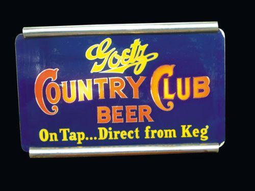 Goetz Country Club Beer light up glass sign. Works, small chip lower right corner otherwise excellent condition. 24 X 15 inches.