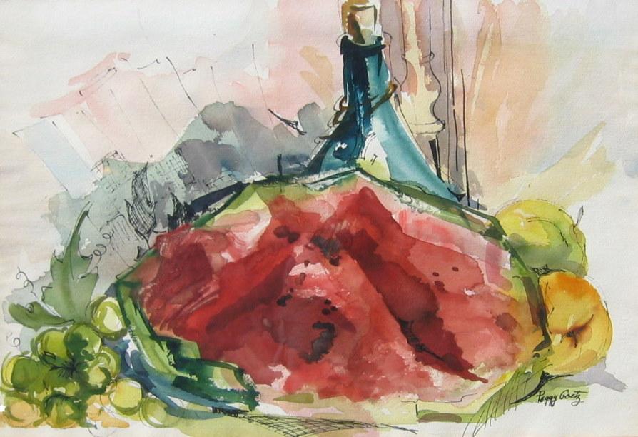 PEGGY GOETZ (American, 20th Century) Still Life with Wine Bottle & Fruit Watercolour 15" x 22" (38.1 x 55.88cm.) Signed lower right