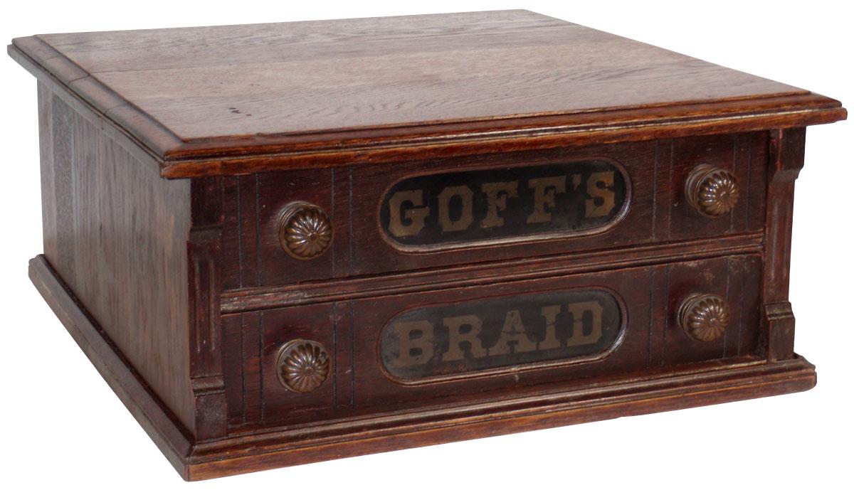 Goff's Braid cabinet, oak 2-drwr w/brass mushroom knobs, VG orig cond w/traces of orig adv on back, 8"H x 14"W x 14"D.