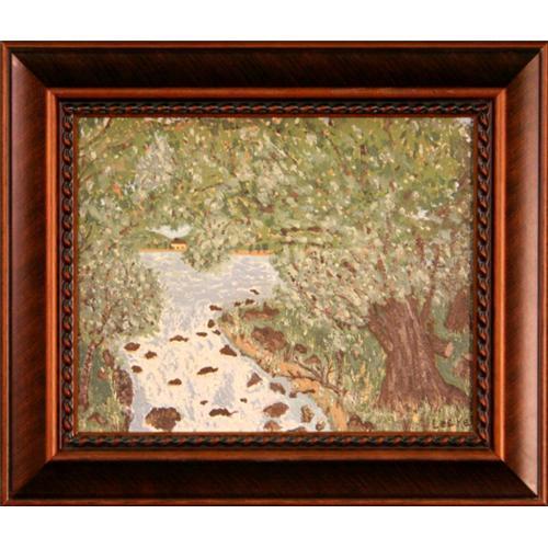 </font></strong>Leskell, an imaginative Canadian artist, has created a very impressionistic original painting done in acrylic. The water can be seen rushing forward as it skims over the rocks on its journey downstream, leaving behind white foam from its turbulence. Trees stand on either side of the bank, creating a thick barrier of growth through which the viewer can just glimpse a house and a lovely blue sky in the distance. While the colors are a bit subtle, the application of the paint is anything but; instead, the paint has been liberally applied in layers to create interesting textures, which are caused by the quick brushstrokes used to paint it. The frame that encases this loose rendering is a gorgeously dark brushed wood that is trimmed with lighter non-brushed liners and also has an intricate roping accent around the inner perimeter. In totality, which includes this charming frame, this piece?s dimensions are 13 3/8? x 11 3/8?. The artist has also signed the painting in the lower right hand corner. This would be a wonderful addition to any impressionism collection and a great deal as well.</font>