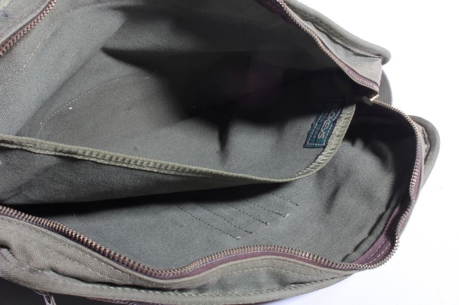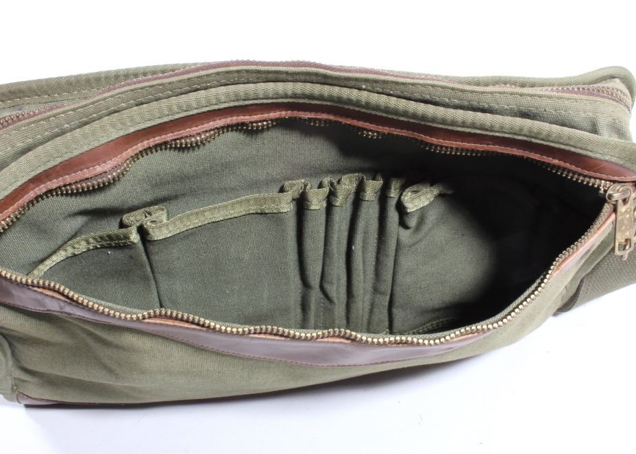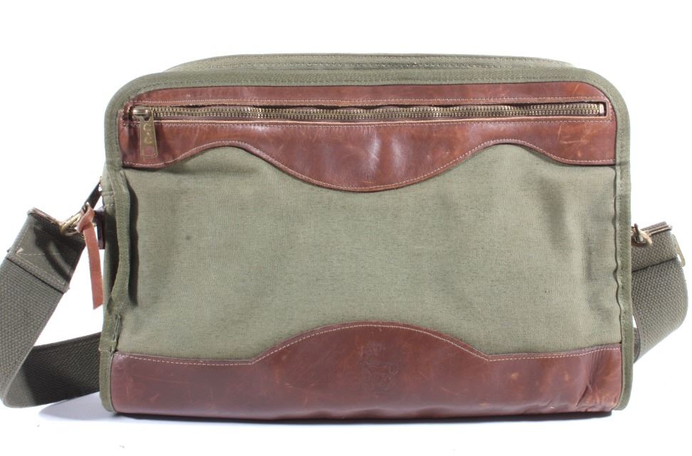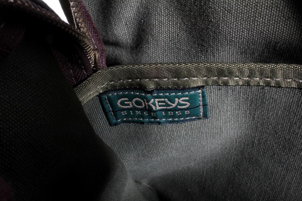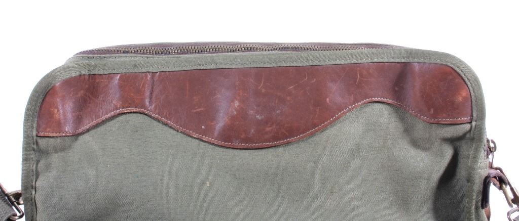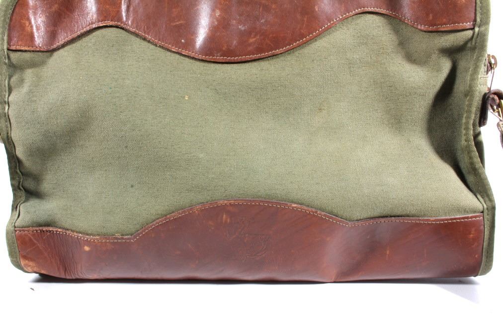 For your consideration is a vintage Gokey canvas laptop travel bag from their St. Paul Minnesota store. This finely crafted piece is constructed out of canvas and features leather accents on the front and bottom. The bag does show signs of wear, minor staining and a few scratches pretty typical of a 20 year old bag. The Gokey company was bought out by Orvis in 1990. The Gokey brand continues on in their shoes and luggage sold by Orvis, manufacturing of Gokey products occurs in Tipton, Missouri. Bag measures 15.5" x 12.5" x 3".