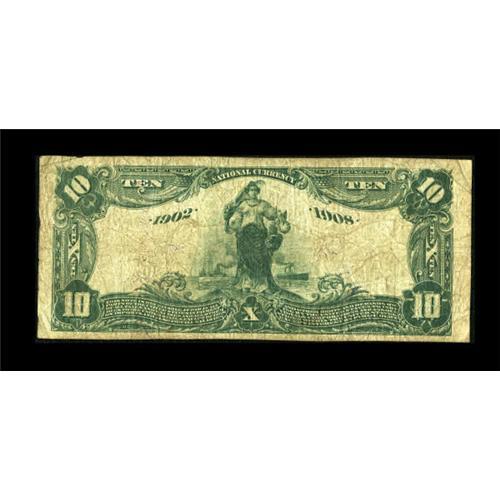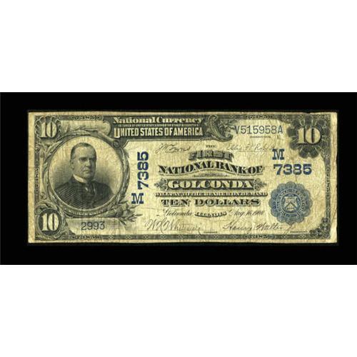 <B>Golconda, IL</B></I> - $10 1902 Date Back Fr. 616 <B>The First NB</B></I> Ch. # (M)7385<BR> One of only two banks to issue within Pope county, with this bank currently having eight Large notes reported. Nice pen signatures of W. R. Whiteside as Cashier, and Henry Walter Jr. as President on this problem free <B>Very Good-Fine </B></I>example.<BR><BR><b>Shipping:</b> Coins & Currency (<a target="_blank" href="http://www.heritageauctions.com/common/shipping.php">view shipping information</a>)