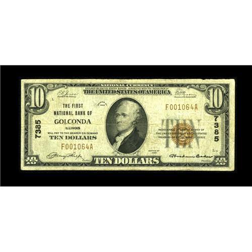 <B>Golconda, IL</B></I> - $10 1929 Ty. 1 <B>The First NB</B></I> Ch. # 7385<BR>A solid <B>Fine+++</B></I> from a Pope County issuer with just four small survivors documented in the Kelly census. The is the fifth, and just the fourth of its type and denomination to surface. Given the current level of interest in Illinois material, our estimate may well prove conservative.<BR><BR><b>Shipping:</b> Coin/Currency (<a target="_blank" href="http://www.heritageauctions.com/common/shipping.php">view shipping information</a>)