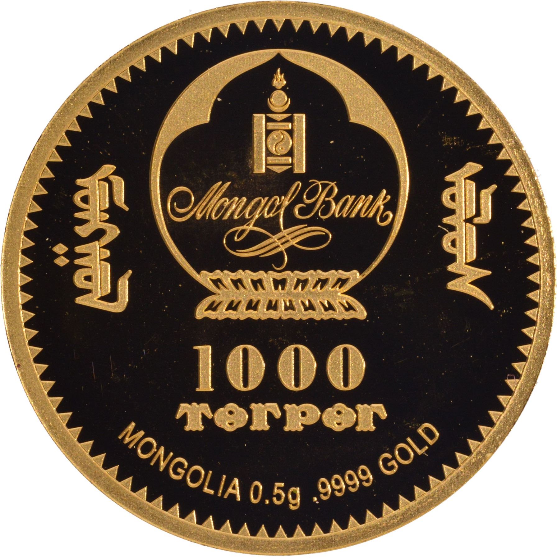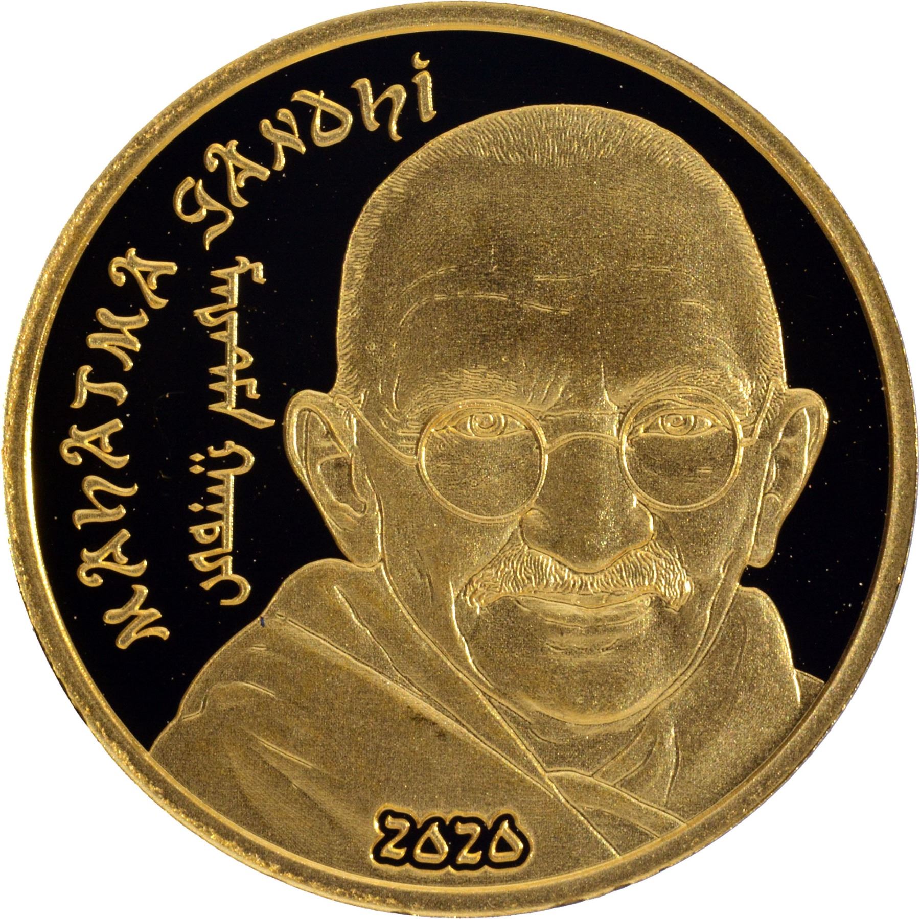 Mongolia, Revolutionaries Series - Mahatma Gandhi, Proof Gold 1000 Togrog, 2020, Obv: portrait of Mahatma Gandhi, a legend in Latin and Mongolian MAHATMA GANDHI on the left field and date below, Rev: the coat of arms of the Bank of Mongolia, Cyrillic script 1000 Togrog below, Latin legends in the fields, country name, metal and purity details in the exergue, 0.50g, 13.69mm, proof.