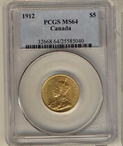Gold 1912 $5 PCGS MS64. Superb fields.
