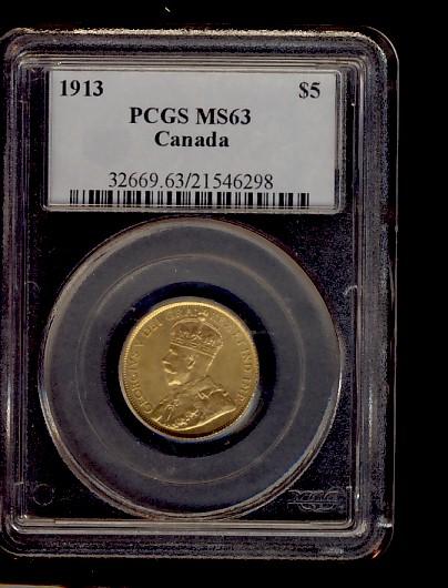 Gold 1913 $5 PCGS MS63, good lustre with nice fields.