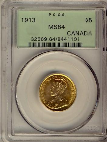 Gold 1913 $5 PCGS MS64. Superb fields and eye appeal.