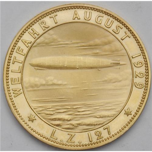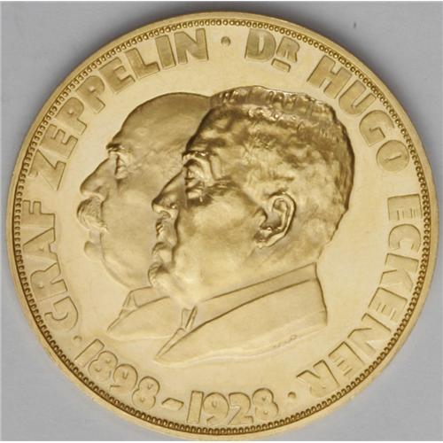 <B>Gold 1929 (Prussian mint) "Graf" Zeppelin world flight medal, </B></I>36mm, .900 fine, 22.9 gms. Conjoined busts of the Graf von Zeppelin and Dr. Eckener left on the obverse. The reverse shows the airship LZ127 over the ocean. Kaiser 510.2 (but listed as 18 Kar.). Nice Proof in a contemporary box.