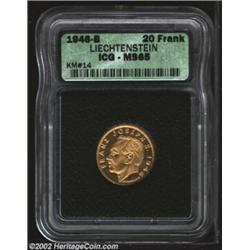 Gold 20 Frank 1946B,Y14, MS65 ICG. Important notice: We expect to be auctioning lots at the rate of 200-250 per hour. Sometimes eBay Premier live bid software cannot keep up with that pace, so we strongly recommend that you place a realistic proxy bid now as insurance to avoid disappointment. Also please note that all Heritage/CAA lots purchased through eBay Premier carry a 20% Buyer's Premium. Please make sure you read the Terms and Conditions.