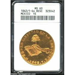 Gold 8 Escudos 1862/1 Go-YE, KM383.7, MS 60 ANACS. Fully brilliant and well-struck, this coin appear