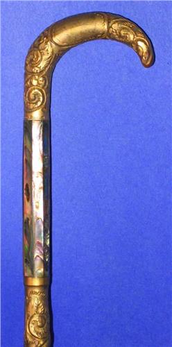 Charming late 1800's American dress cane. Rolled Gold & abalone handle w/ rolled gold ferrule cap and collar on ebony shaft. Blank cartouche ready for your monogram. L:34.5"
