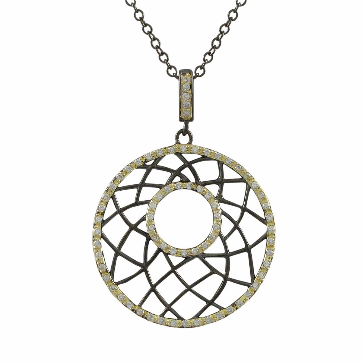 Gold And Black Over Sterling Silver 30Mm Circle Pendant, Line Design, With White CZ- 1.54"