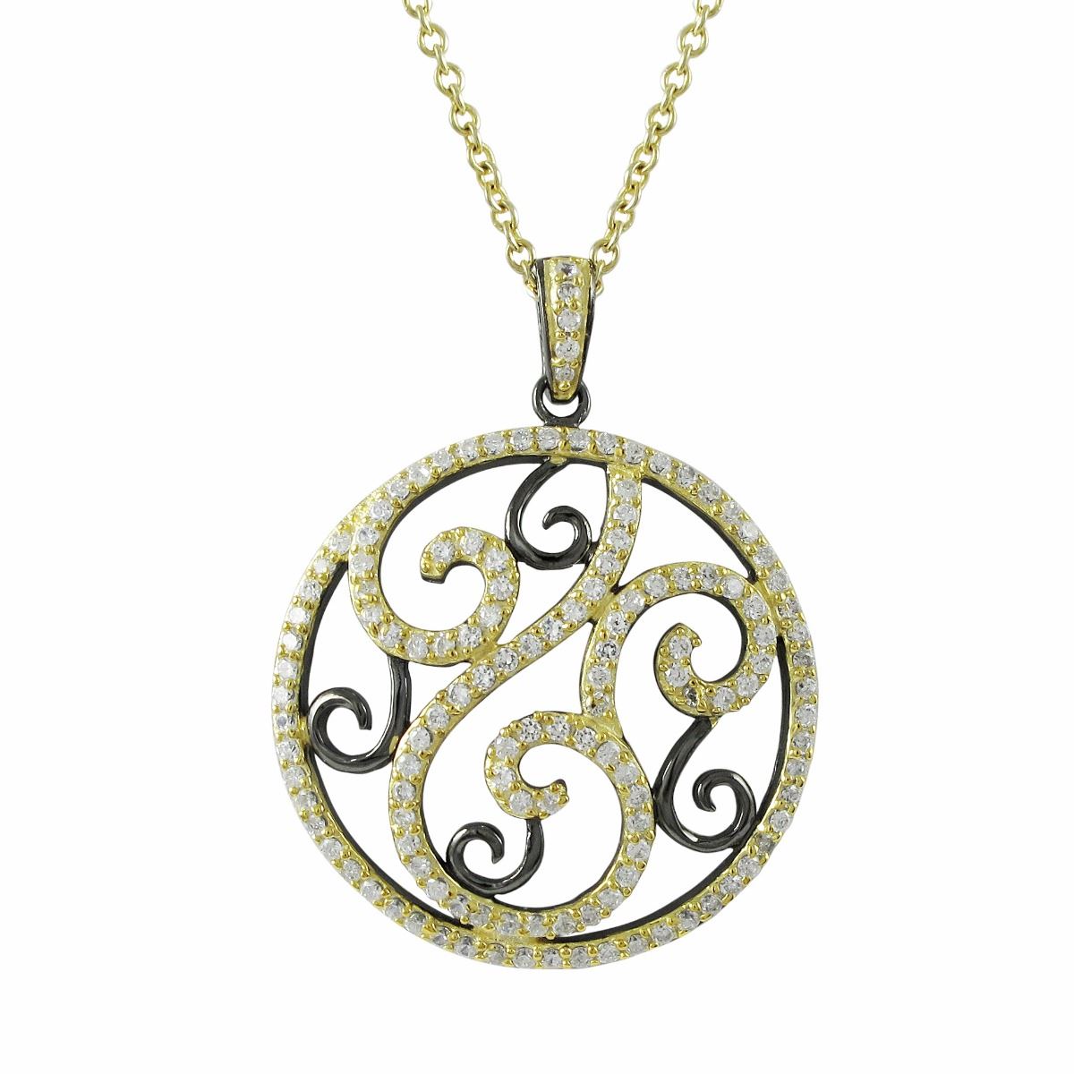 Gold And Black Over Sterling Silver Pendant, Swirl Design With White Czs, 42Mm Long, Circle Is 32Mm Wide
