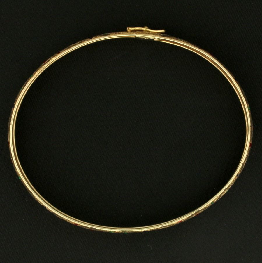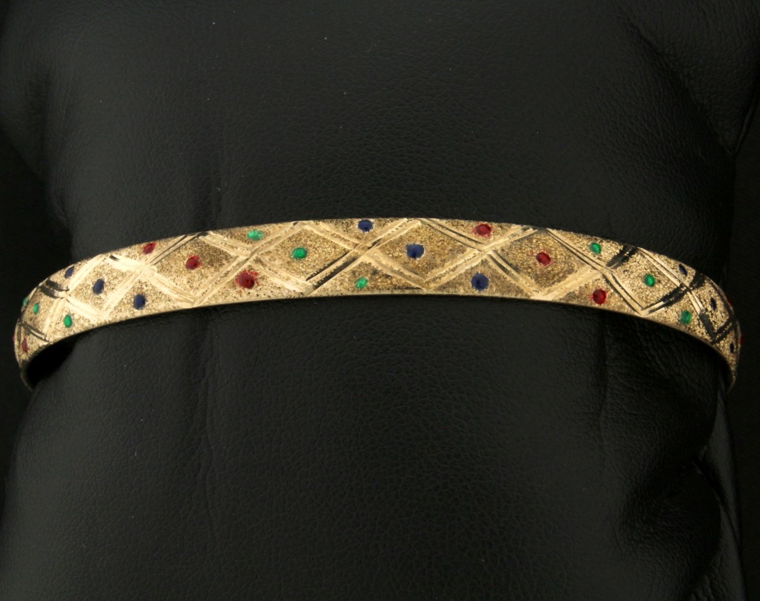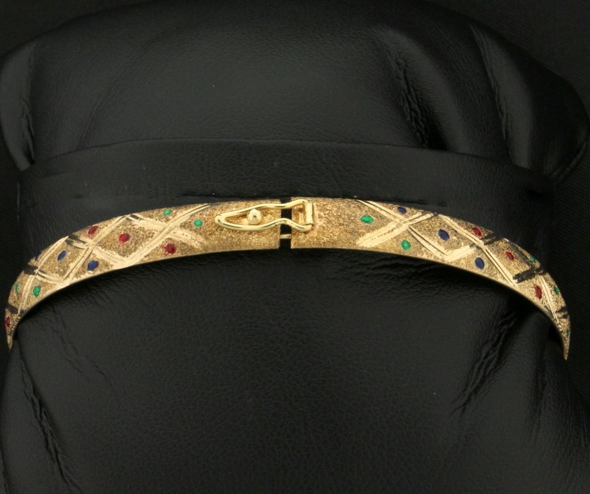 In 10K Yellow Gold. Contains fifty five glass accents made to look like emeralds, rubies, and sapphires. 2 5/8" x 2 3/8" interior dimensions. Can open/close for easy putting on, taking off. With safety clasp. 3.9g