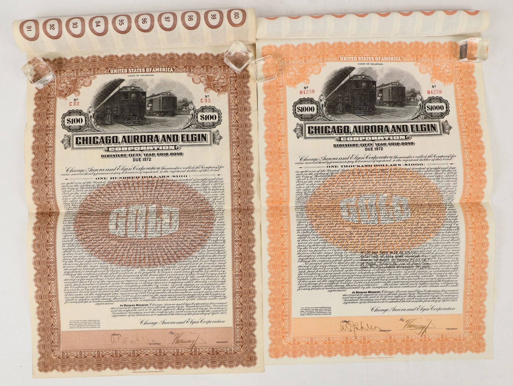 Pair of gold bond debenture certificates from the Chicago, Aurora and Elgin Corporation, dated 1922. Both issued w/ signatures of secretary and president + embossed company seal. Lot includes one orange $1000 cert and one brown $100 cert. Excellent train vignette on both. Attached bond coupons on both. Brown cert in rougher condition than orange cert; see photos.