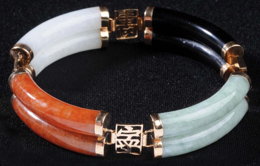 Description Marked "14K Gold". Light green to orange and dark green color variation with Oriental motif on links in between. Condition (Excellent). Size 7" L.