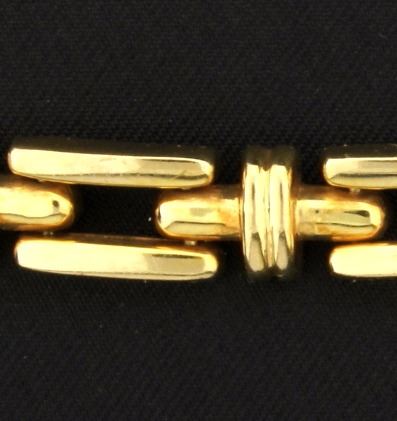 This 9K yellow gold bracelet is 7 1/8 inches long and 7.5mm wide. It has a lobster clasp. 12.0g