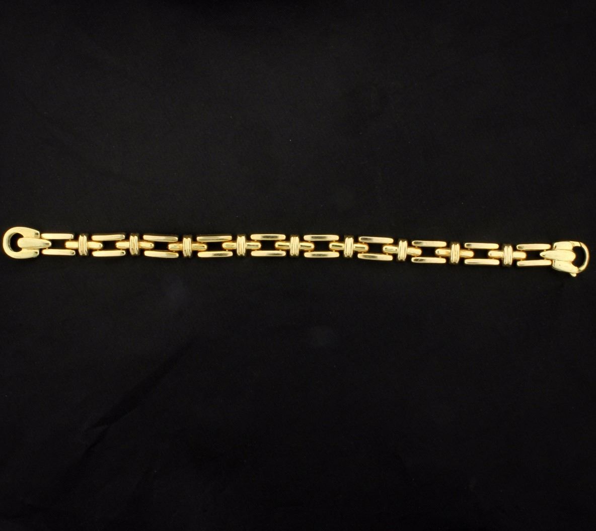 This 9K yellow gold bracelet is 7 1/8 inches long and 7.5mm wide. It has a lobster clasp. 12.0g
