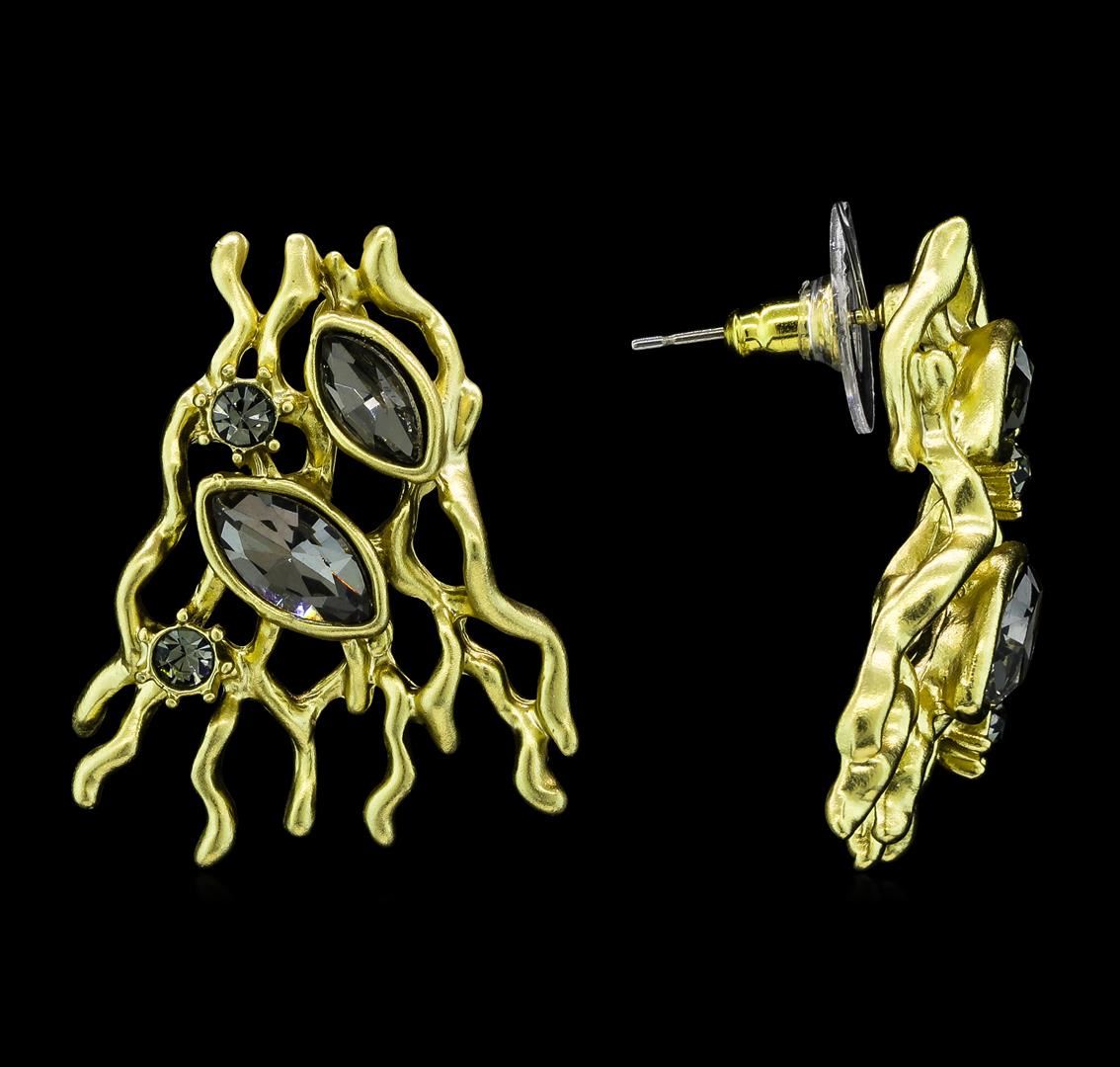 High end designer jewelry. Gold Branches Crystal Earrings - Gold Plated. Gold Plated Metal/1.5" Drop. Gold/ Smoky. Post.