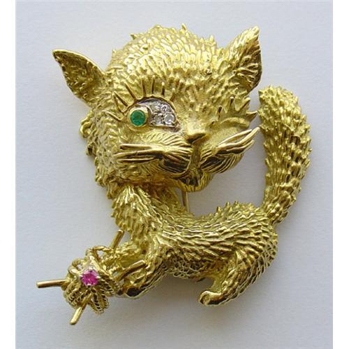 Humorous 18Kt. gold cat pin in the form of a sly, winking cat playing with yarn wrapped around two knitting needles. The cat's body has realistically depicted fur, and the animal stands with an arched back and tail. A round faceted bezel-set emerald appears as the pupil in the open eye; four round faceted pave-set diamonds form the white of the eye. A round faceted prong-set ruby appears on the ball of yarn.