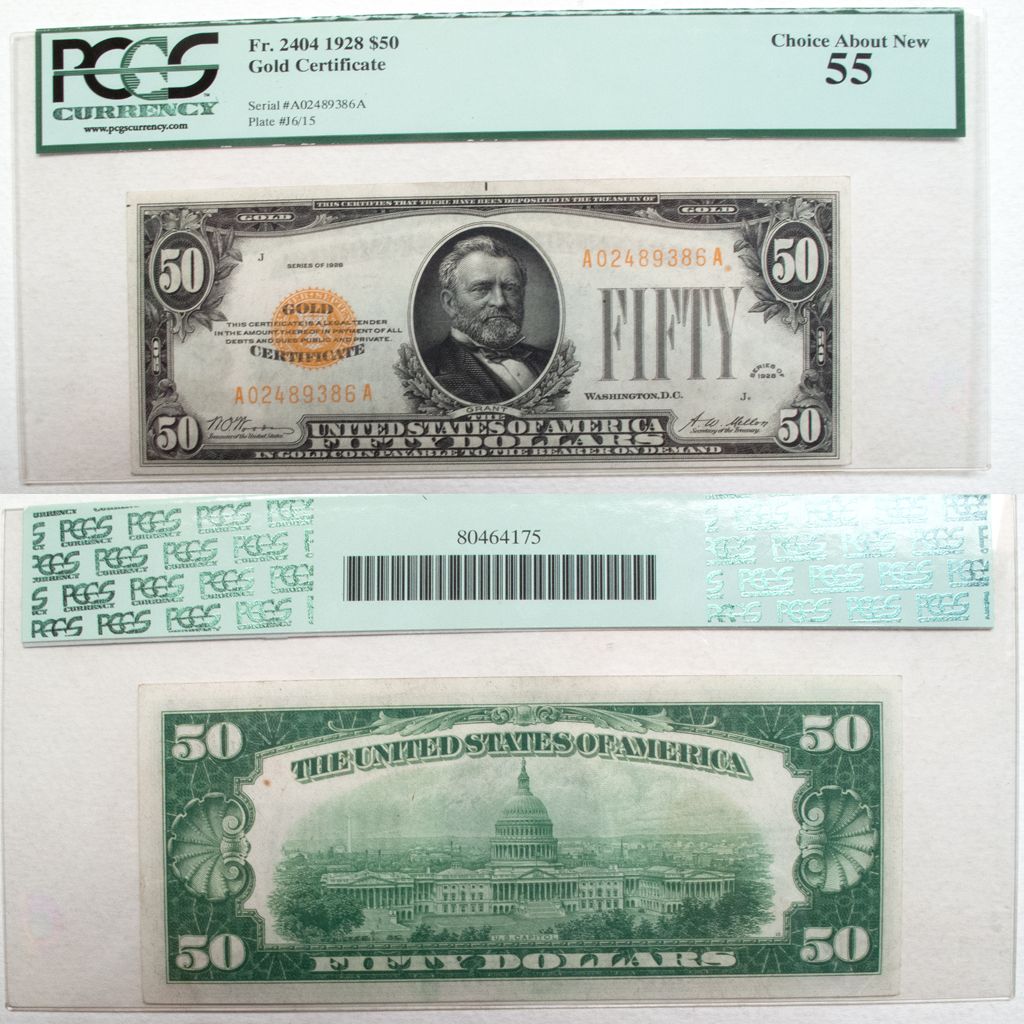 1928 $50 Gold Certificate Signed by Woods and Mellon. S/N A02489386A. PCGS rated 55 Choice About New.