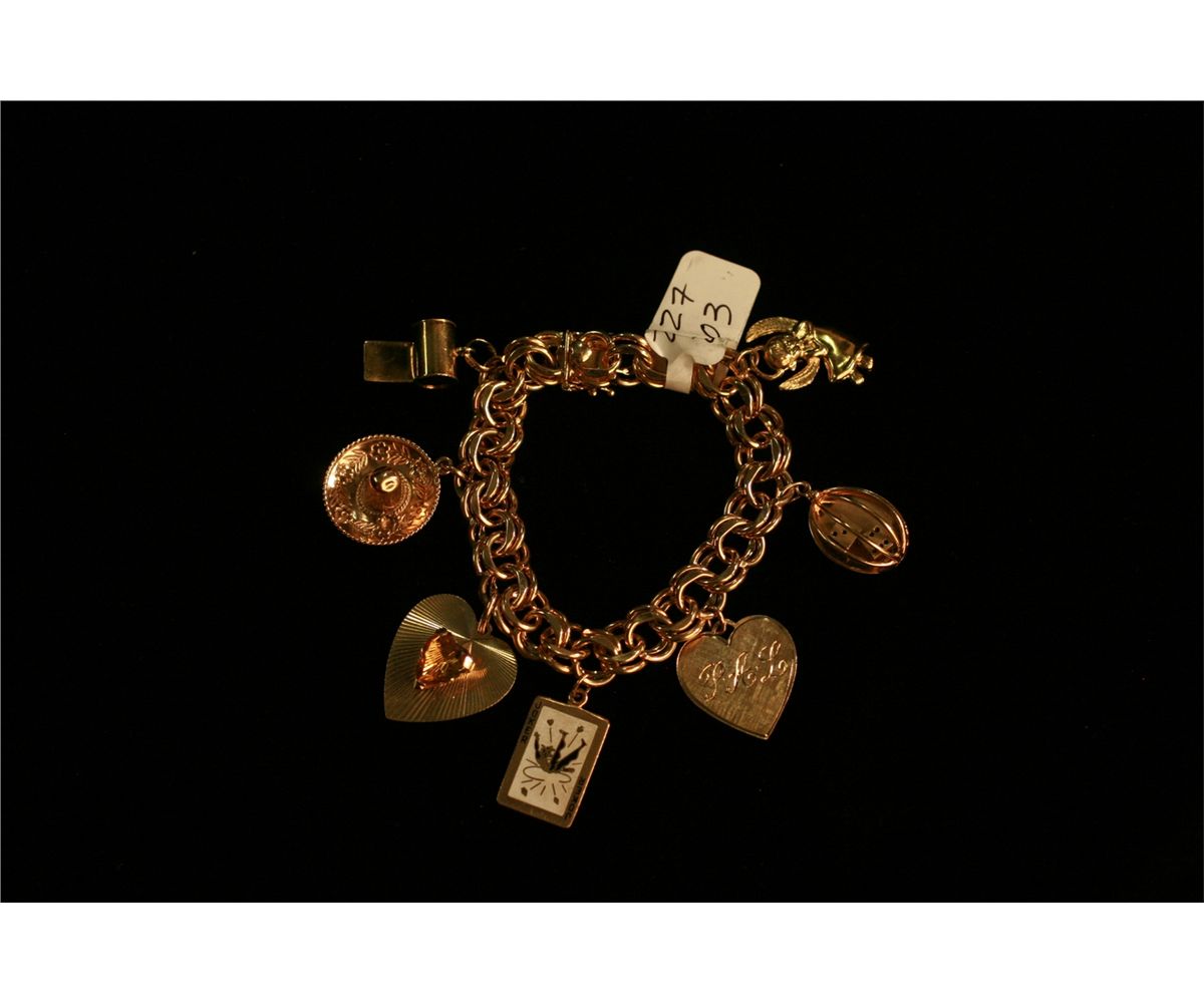 Gold Charm Bracelet, Marked 14k , (7)- 14k charms, Each approximately 3/4" in diameter, 61.2 grams, -227203-