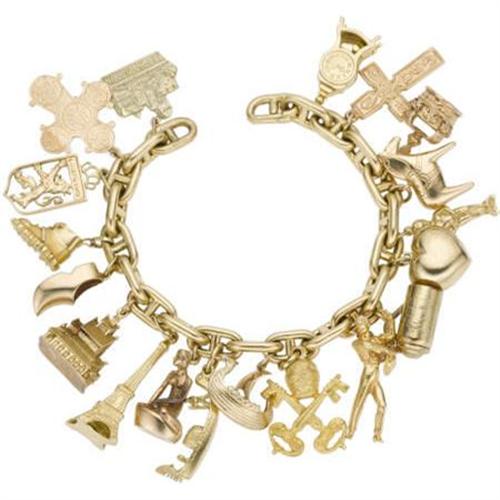 <B>Gold Charm Bracelet</B></I> The 14k yellow gold charm bracelet features various charms designed as worldly figures, including: one 18k yellow gold grandfather clock, enhanced by swinging pendulum; one 9k pink gold cross; one 10k pink gold crown; one 10k yellow gold horse statue; one 18k yellow gold boy statue; one 14k yellow gold heart; one 9k yellow gold beer stein, engraved <I>HB </B></I>for Hoffbrau Brew House; one 10k yellow gold dancer; one 18k yellow gold crown with keys; one 10k yellow gold ship; one 18k yellow gold ship; 14k pink gold lady kneeling; one 18k yellow gold Eiffel tower; one 14k yellow gold building; one 10k yellow gold wooden shoe; one 18k yellow gold hiking shoe; one 14k yellow gold crest; one 14k yellow gold cross; together with one <I>Liechtenstein</B></I> landscape charm. Gross weight for the bracelet is 87.00 grams.<BR><I>Length: 7 inches</B></I><BR><BR><b>Shipping:</b> Miscellaneous Collectibles, Smal (<a target="_blank" href="http://www.heritageauctions.com/common/shipping.php">view shipping information</a>)
