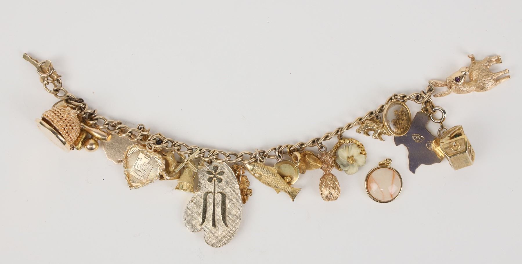 Eight inch long bracelet with 18 gold charms attached. Flower, 10 karat (1.3 gr. net); Pineapple, 14 k (5 gr.); RAM, 10 K (2.3 gr.); gold pan, 10 k (0.7 gr.); "nugget" 10 k, (5 gr.); Utah heart, 14 k (2.5 gr.); Georgia, 14 k (3 gr.); placer gold; other small charms may be gold, too small for us to test. Has at least $850 in gold at $4000 an ounce.