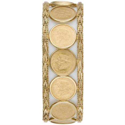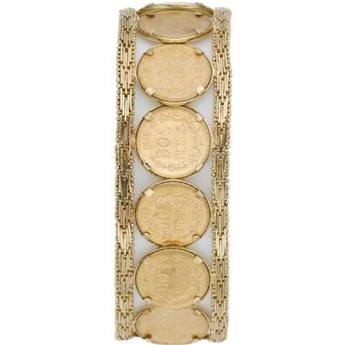 <B>Gold Coin, Gold Bracelet</B></I> The bracelet features a line of thirteen Mexican Dos Pesos gold coins, each dated 1945, outlined by fancy like chain in 18k yellow gold. Gross weight 46.90 grams.<BR><I>Dimensions: 7 inches x 13/16 inch</B></I><BR><BR><b>Shipping:</b> Miscellaneous Collectibles, Smal (<a target="_blank" href="http://www.heritageauctions.com/common/shipping.php">view shipping information</a>)