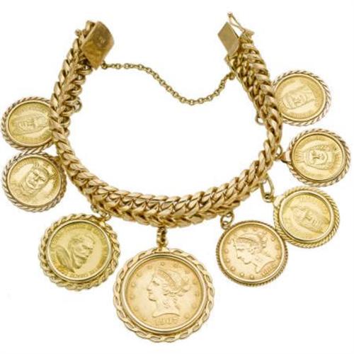 <B>Gold Coin, Gold Charm Bracelet</B></I> The 18k yellow gold charm bracelet suspends various coins, including: one Venezuela gold coin, depicting <I>Guaicaipur </B></I>on the front, having <I>Caciques de Venezuela </B></I>on the reverse; one Venezuela gold coin, depicting <I>Urimare</B></I> on the front, having <I>Caciques de Venezuela </B></I>on the reverse; one Venezuela gold coin, depicting <I>Tamanaco</B></I> on the front, having <I>Caciques de Venezuela </B></I>on the reverse; one $5 U.S. Liberty gold coin, dated 1882; one $10 U.S. Liberty gold coin, dated 1907; one <I>Diego De Losada, Fundador De Santiago De Leon De Los Caracas</B></I>, dated 1567; one Venezuela gold coin, depicting <I>Tiuna</B></I>, having <I>Caciques de Venezuela</B></I> on the reverse; together with one Venezuela gold coin, depicting <I>Tamanaco</B></I>, having <I>Caciques de Venezuela </B></I>on the reverse. Gross weight for the bracelet is 148.60 grams.<BR><BR><b>Shipping:</b> Miscellaneous Collectibles, Larg (<a target="_blank" href="http://www.heritageauctions.com/common/shipping.php">view shipping information</a>)