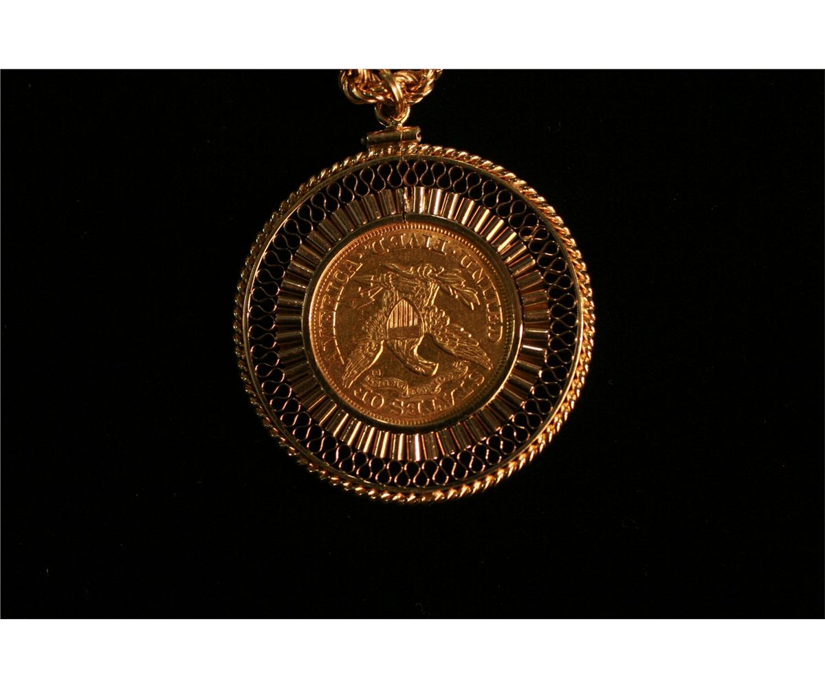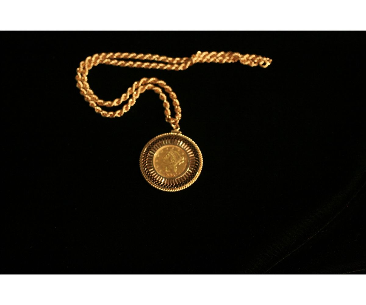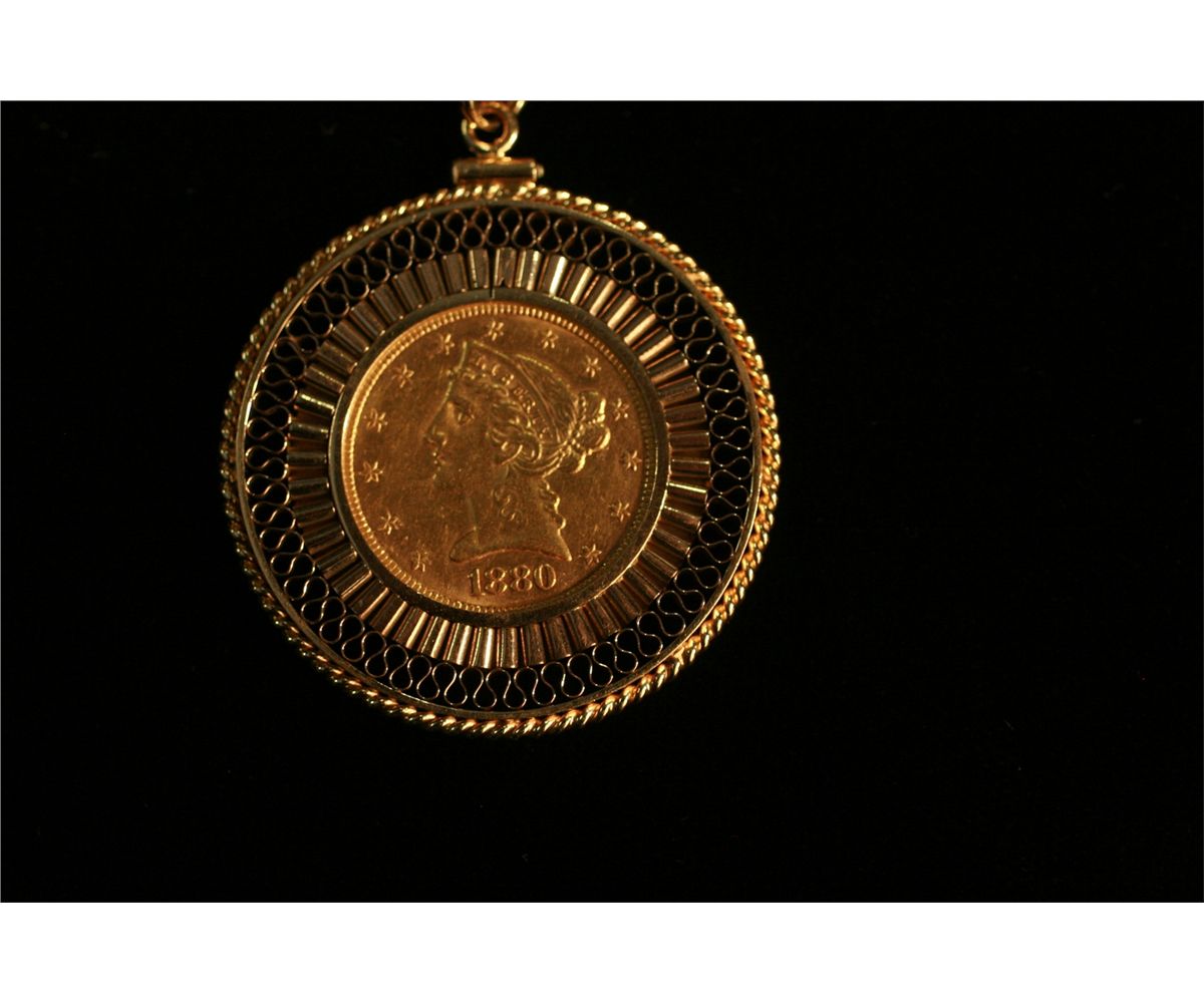 Gold Coin Necklace, 5 dollar gold piece set in filigree bezel, Marked 14k, Liberty head coin dated 1880, Total weight 23.3 grams, -227201-