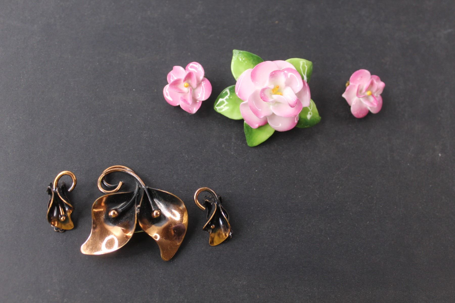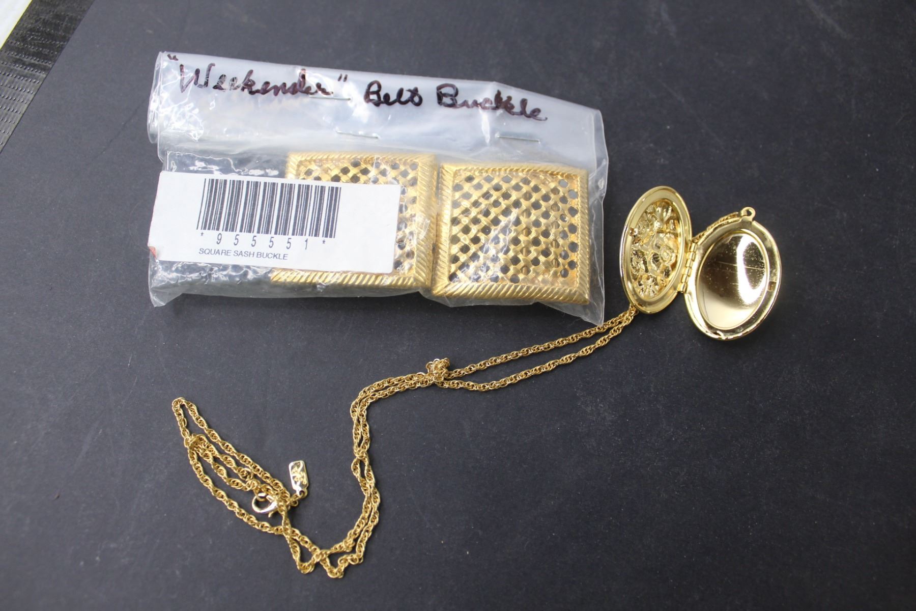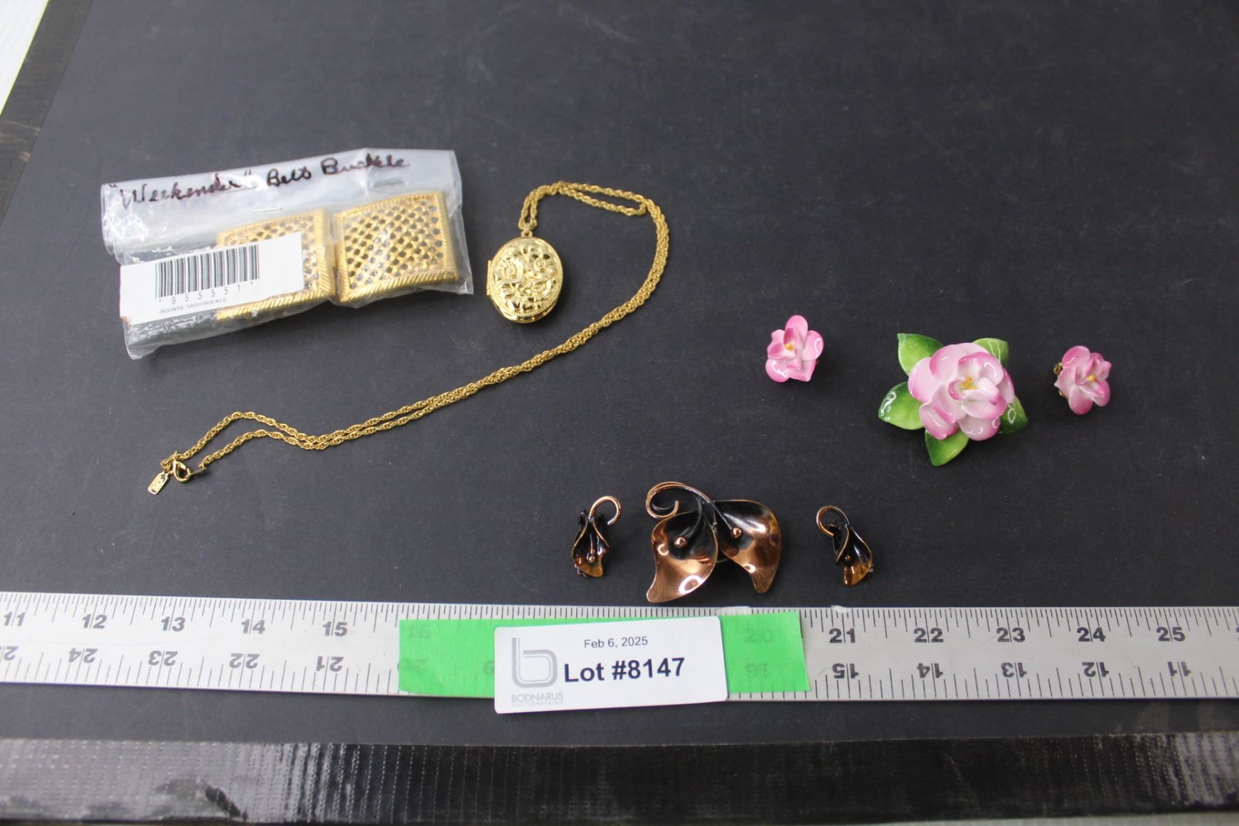 Gold Colored Belt Buckle, Locket Necklace, (2) Broach & Clip on Earring Sets