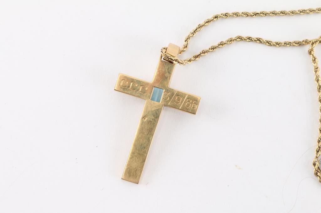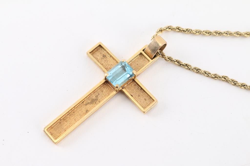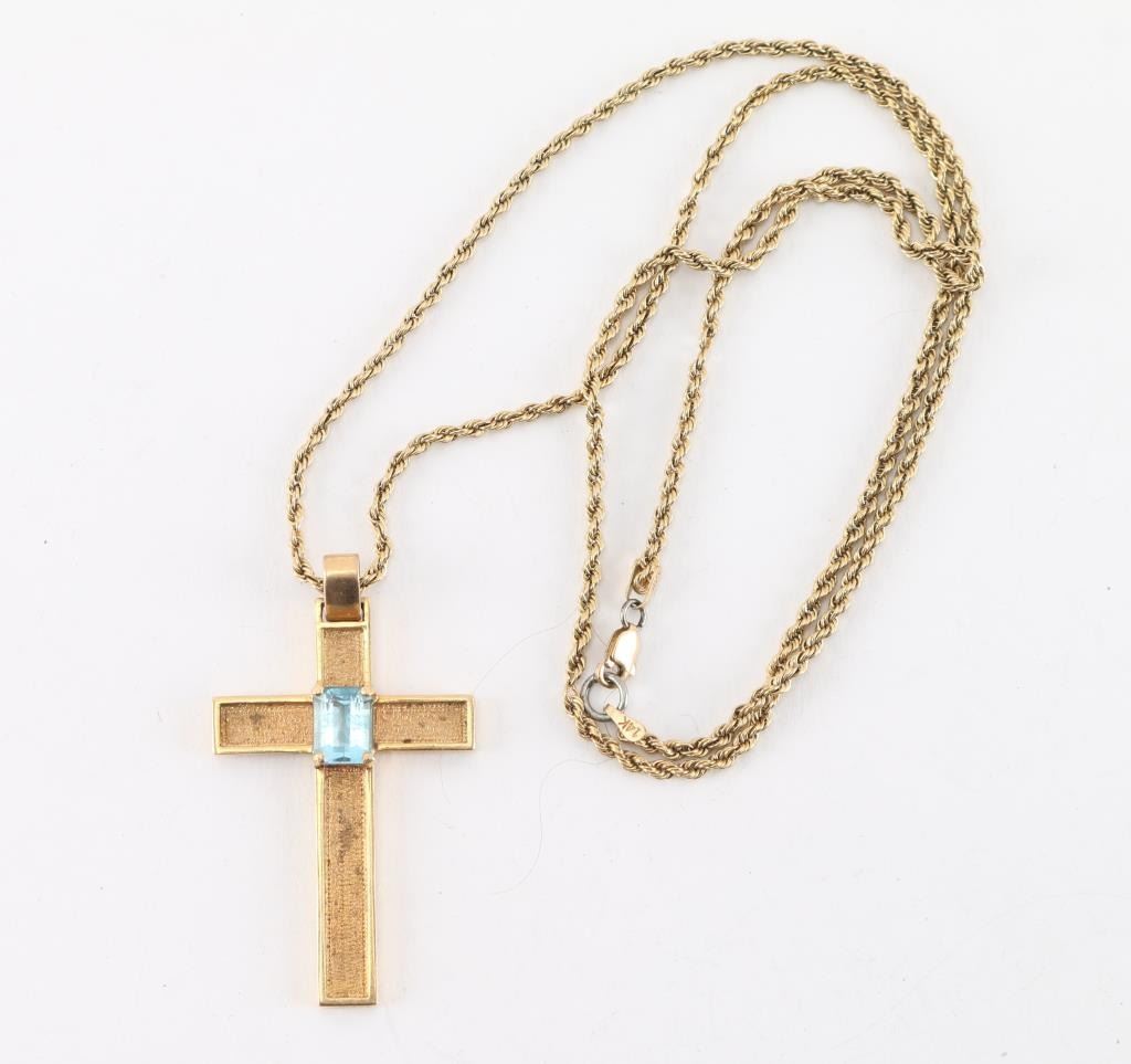 With 1/4" squared aquamarine, on 14K gold chain. Cross measures 2" x 1 1/4" and necklace in total is 14 1/2" from drop.