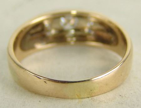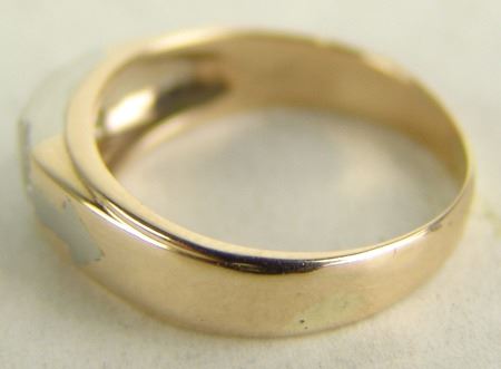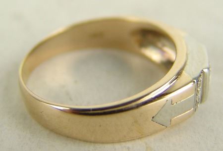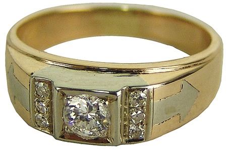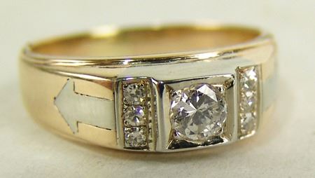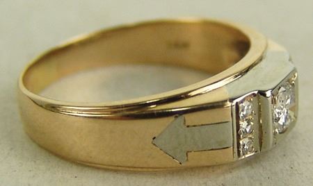Late 1900s, Beautiful solid 14kt gold ring with inlaid white gold arrows and with one .3 ct round brilliant diamond flanked by six small diamonds. Very good condition. Net wt. 5.3g. Size 10