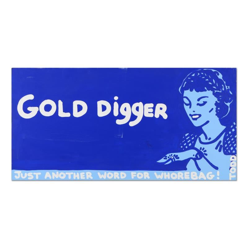 "Gold Digger" is an original acrylic painting on canvas by Todd Goldman, hand signed by the artist. This piece comes gallery wrapped. Includes Certificate of Authenticity. Measures approx. 48" x 24" (image). ** Please note: There is a noticeable white scuff mark on the image below the first "g" in "Digger", as well as other minor scuff marks. **