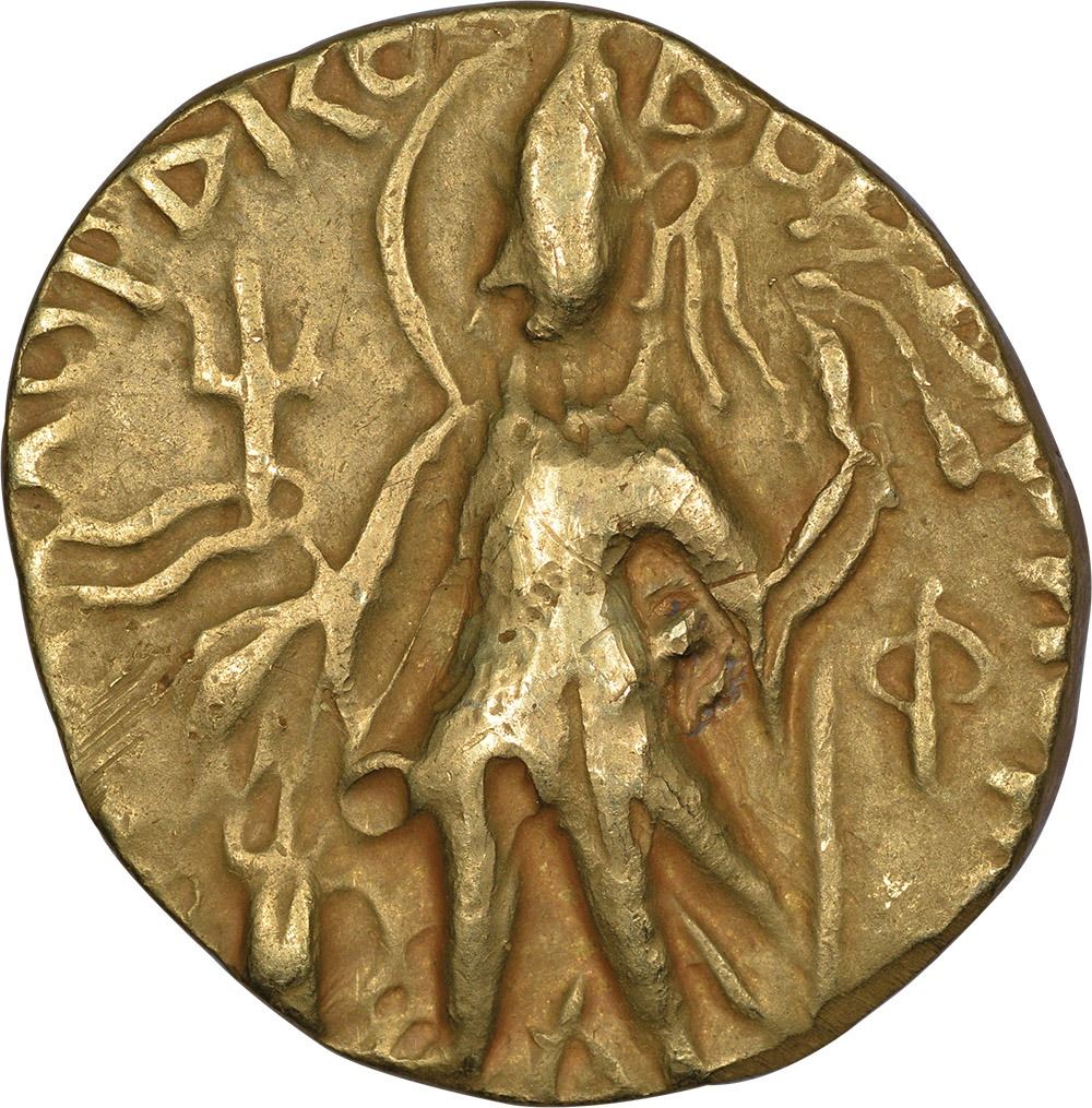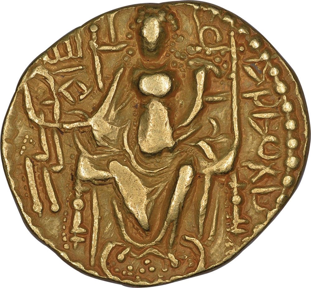 Kushan Dynasty, Vashishka(240-250 AD),Gold Dinar, Obv:king standing facing, holding a trident in right hand and sacrificing at altar at left, second trident above altar, bactrian legend around: þAONANOþAO B ... A ZηþKO KOþANO brahmi letters"CHHU"at right,"THA"between legs,"VAI"at left,Rev:ardokshoenthroned facing, holding diadem and cornucopia, bactrian legend right, brahmi "tha" at top right, tamgha at left,7.80g, 21.60mm,(Gobl # 559),about extremely fine,Scarce.