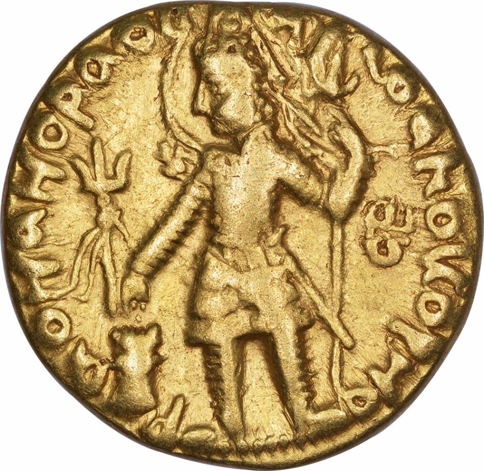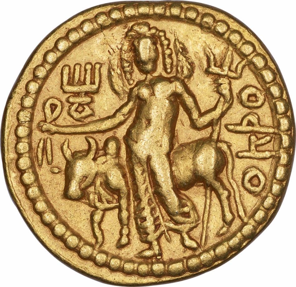 Kushan Dynasty, Vasudeva I(190-230 AD), Gold Dinar, OESHO Type, Obv:crowned, diademed king standing facing, nimbate, holding trident and sacrificing at altar at left, second trident above fire altar, Bactrian legend aroundþAONONOþAO BA .. ZΔOηO KOþONO (King of Kings Bazodeo Kushan),nandipada in right field,Rev:lordshiva standing facing, holding trident and wreath, the bull nandi standing behind facing the left side withBactrian legend at leftOηþO (OESHO)and tamghaat left, 7.8g, 20.22mm,(Gobl # variant of 657),about extremely fine+,broad flan with complete and clear details, superb quality,Scarce.
