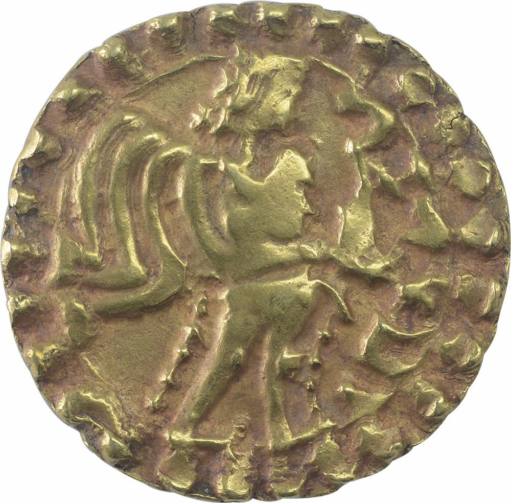 Post Gupta, Samatata(630 AD),Gold Dinar,Broad Flan,Obv:king facing left holding bow left and arrow in right hand, (horse headed or Shankha standard ?) standard behind, border of dots,Rev:goddeesslakshmi standing right, illegible inscription in right field, stylized dotted border, 5.51g, 21.95mm,(BMC # Pl. XXIV-19),about extremely fine+,Rare.