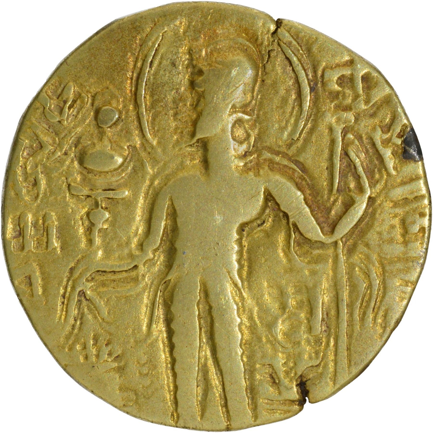 Gupta Dynasty, Samudragupta (335-370 CE), Gold Dinar, “Scepter/Standard” type, Obv: the king standing facing left, nimbate, holding the royal scepter (Rajadhanda), adorned with a ribbon in his left hand and sacrificing over an altar, a Garuda standard in the left field, the Brahmi legend “Samudra” below the king's arm, a circular Brahmi legend “Samarasata(vitatavijayojitaripurajito di)vam jayati" around the field, Rev: the goddess Lakshmi, nimbate, seated on a high backed throne whose all legs are clearly visible, with her feet resting on a circular mat below, a noose and a cornucopia in her hands, a tamgha in the top-left field and a small symbol on the top-right, the Brahmi legend “Parakramah” in the right field, a dotted border around the field, 7.58g, 20.2mm, (Unlisted type), choice very fine, Extremely Rare.
