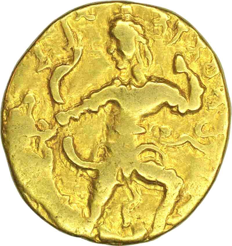 Gupta Dynasty, Chandragupta II (375-415 AD),Gold Dinar, Lion Slayer Type, Obv: king standing right wearing a coat, shooting an arrow in the mouth of lion while trampling him with the right foot, incomplete brahmi legend on the coin "narendrachandra...ptah",Rev: royal tamgha at left"simhavikrama"brahmi legend, lakshmi holding a flower and noose in her hands with both legs drawn up and seated on lion facing/moving left,7.75g, 19.60mm, (Altekar # Class II, Variant A),about extremely fine, VeryRare.Lion Slayer type coins are rare in the whole Gupta coinage series.
