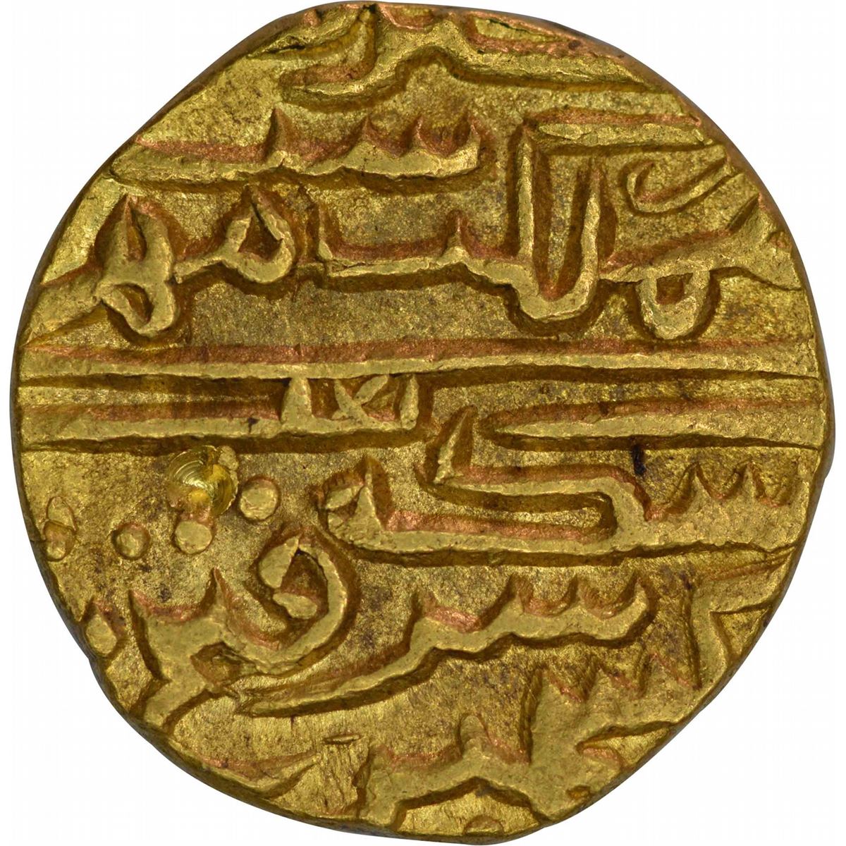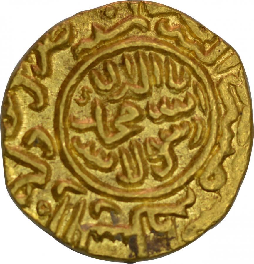 Kashmir Sultanate, Fath Shah, Gold Dinar, Obv: kalima shahda in circle, around zarb and AH year, Rev: kibre mamlakat keh muhr-e-daulat ast, sikka-e-fath shah sultan-e-kashmir ast, 11.30g, 19.45mm,(GG # K 55),about extremely fine,ExtremelyRare.Meaning of the couplet is the glory of the kingdom, which is the sun of the state is the coin of Fath Shah of Kashmir. This specimen is of the first reign of the Fath Shah and also the first gold coin issued by this ruler. Goron and Goenka lists this as RR on the rarity scale.