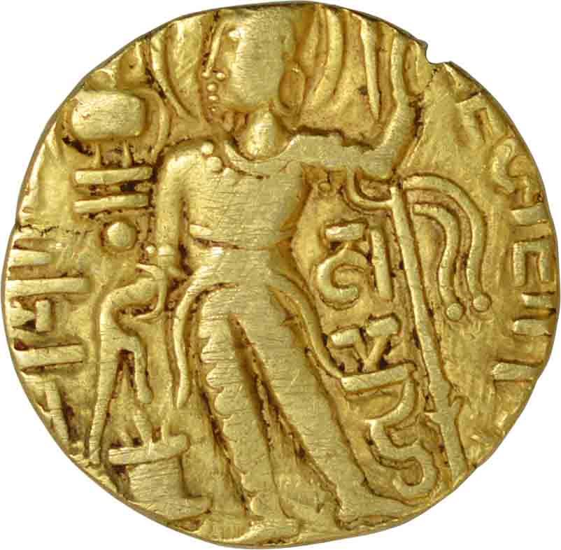 Gupta Empire, Samudragupta (335-370 AD), Gold Dinar, Sceptre Type (Standard), Obv: king nimbate, standing facing left, garuda standard and sacrificing over altar and brahmi legend in left "samudra", Rev: goddess lakshmi seated on throne holding diadem and cornucopia with differentt style tamgha to left with legend "parakramah" in the right field, 7.55g, 20.66mm, (BMC PL I - 12),about extremely fine, superb srtike,Scarce.