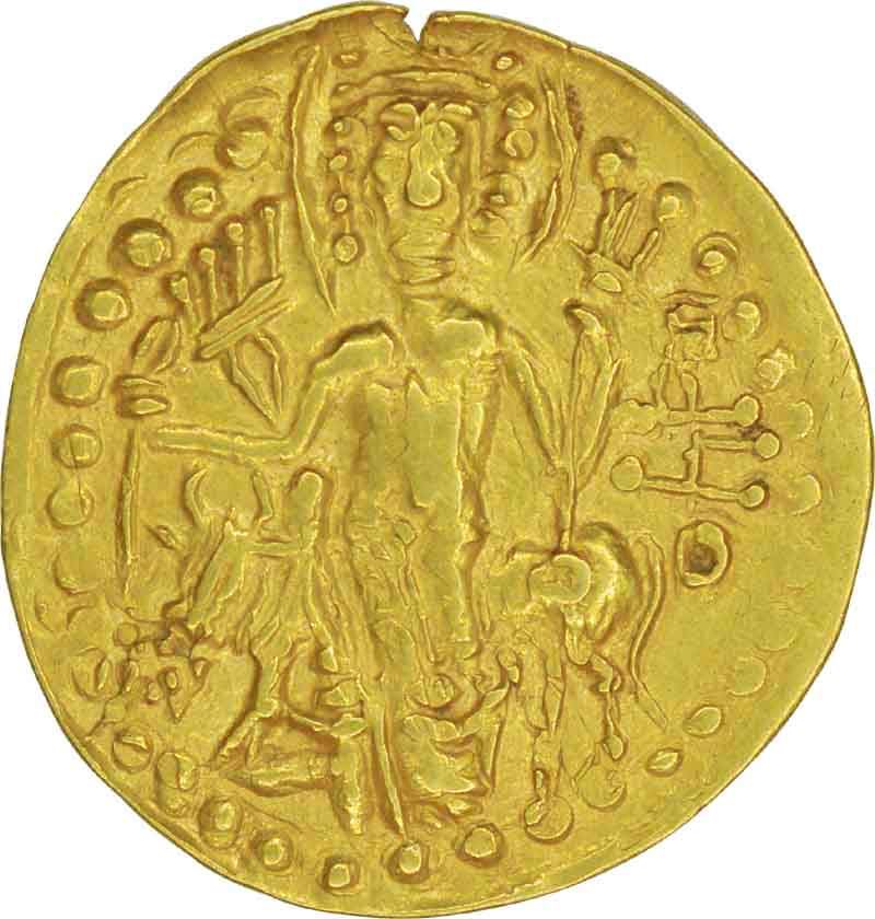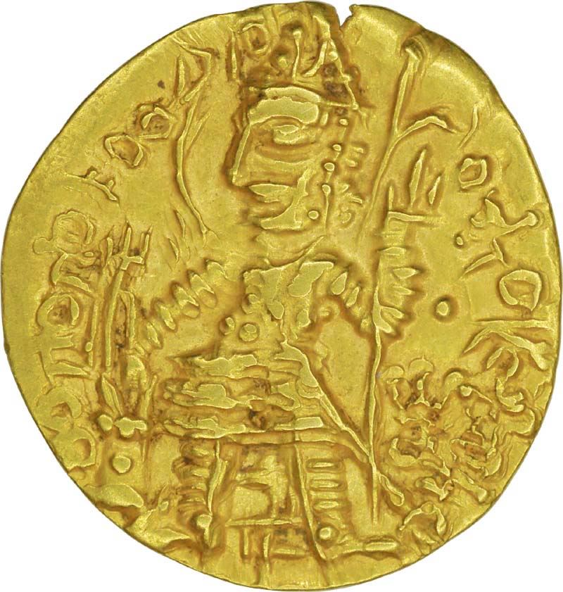 Kushan Dynasty, Vasudeva I(190-230 AD), Gold Dinar, Obv:Crowned, diademed king standing facing, nimbate, holding trident and sacrificing at altar at left, second trident above fire altar, Bactrian legend aroundþAONONOþAO BA .. ZΔOηO KOþONO (King of Kings Bazodeo Kushan), nandipada in right field and retrograded SWASTIKAsymbol between the legs,Rev:crownedlordsiva standing facing, holding trident and wreath, the bull nandi standing behind facing the left side withBactrian legend at leftOηþO (OESHO)and variant stylized tamgha at left, double dotted borders,8.05g, 22.20mm,about extremely fine,broad and wide flan, superb quality, unusual type,Very Rare.A tripedal bull standing on its three legs is depicted on this coinage. Normally a living entity has either two or four legs/hands but this tripedalism denotes virility and unique powers.