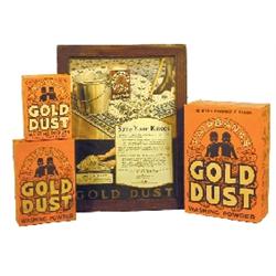 Gold Dust Washing Powder boxes (3), unopened, ea. a different size & framed Gold Dust ad, all VG to Exc. condition, 5" to 13.5"H.