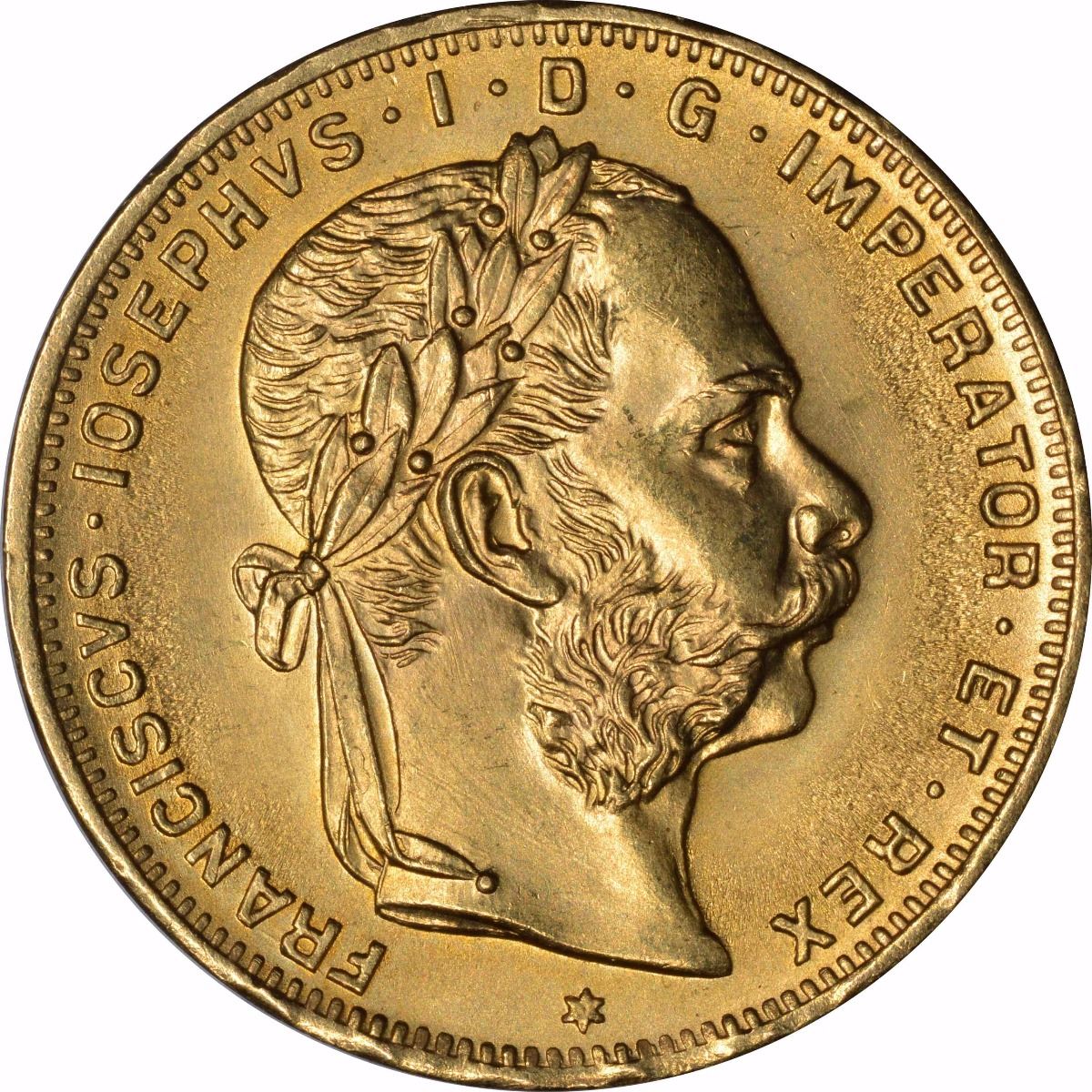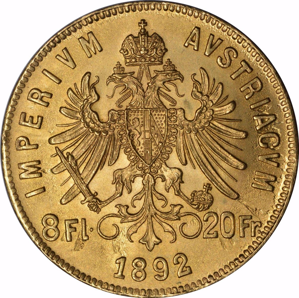 Austria,Joseph I,Gold 8 Florins (20 Francs), 1892 AD,Edge:The edge has an incuse inscription:-VIRIBUS UNITIS,Obv: the laureate head, facing right, of Emperor Franz Joseph I FRANCISCUS IOSEPHUS I D G IMPERATOR ET REX, Rev: the arms of Austria superimposed upon a crowned double-headed Imperial eagle, IMPERIUM AUSTRIACUM, 8 FL 20 Fr, 1892,6.4g,20.63mm, about UNC.All 1892 dated Austrian gold 20 Francs 8 Florinsare Austrian Mint officialre-strikes, issued partially as commemoratives, and partly as a gold bullion coin.The dual denomination 20 francs 8 florins is one of the many varied denominations of gold coin which Austria has produced in its long history. Between 1870 and 1892 Austria produced two different coin types, each of which carried face values in two different monetary systems, this is because these coins were "trade coinage" intended for international use as bullion coins.20 Francs 8 FlorinsThese were issued between 1870 and 1891, but with official re-strikes dated 1892 being issued indefinitely. All the pre 1892 issues tend therefore to be of more interest to collectors, although there is nothing wrong with finding space for the 1892 re-strikes in any collection.