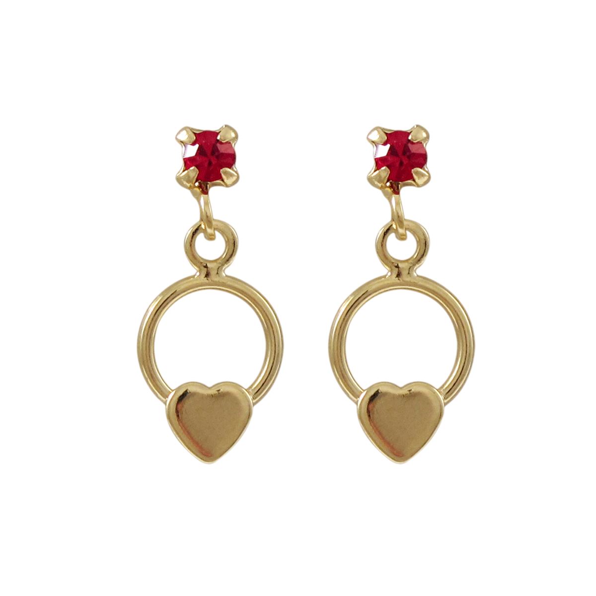 Gold Filled Open Circle Heart Post Earrings With Red Crystal, 0.59"