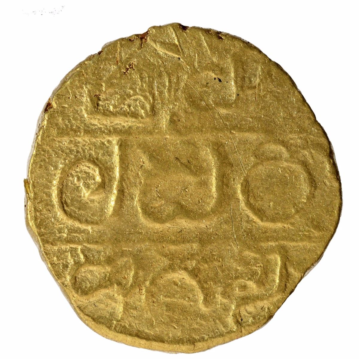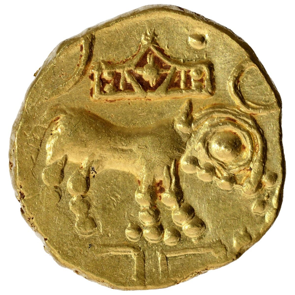 Hoysala Dynasty of Dwarasamudra, Vinayaditya, (1047-1098 AD), Gold Gadyana (Pagoda), Obv: maned lion walking to right, a chhatra-like object flanked by sun and moon, Rev: three line legend in old kannada with interlinear rules Sri Ma/la Pa ro/lu Go nda, 4.0g, 16.51mm, (K. Ganesh # 8.5), about extremely fine, Rare.
