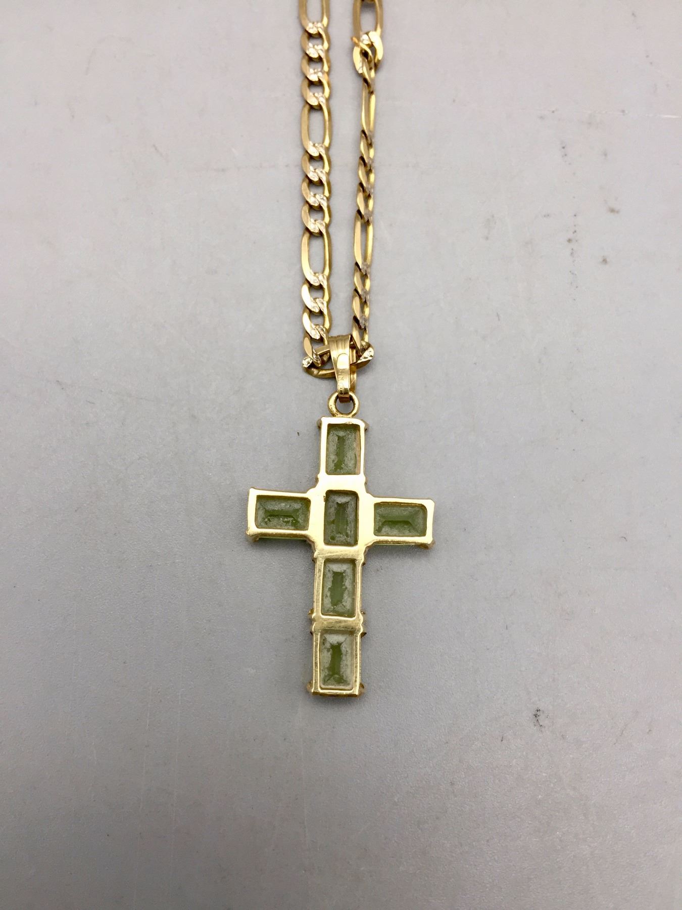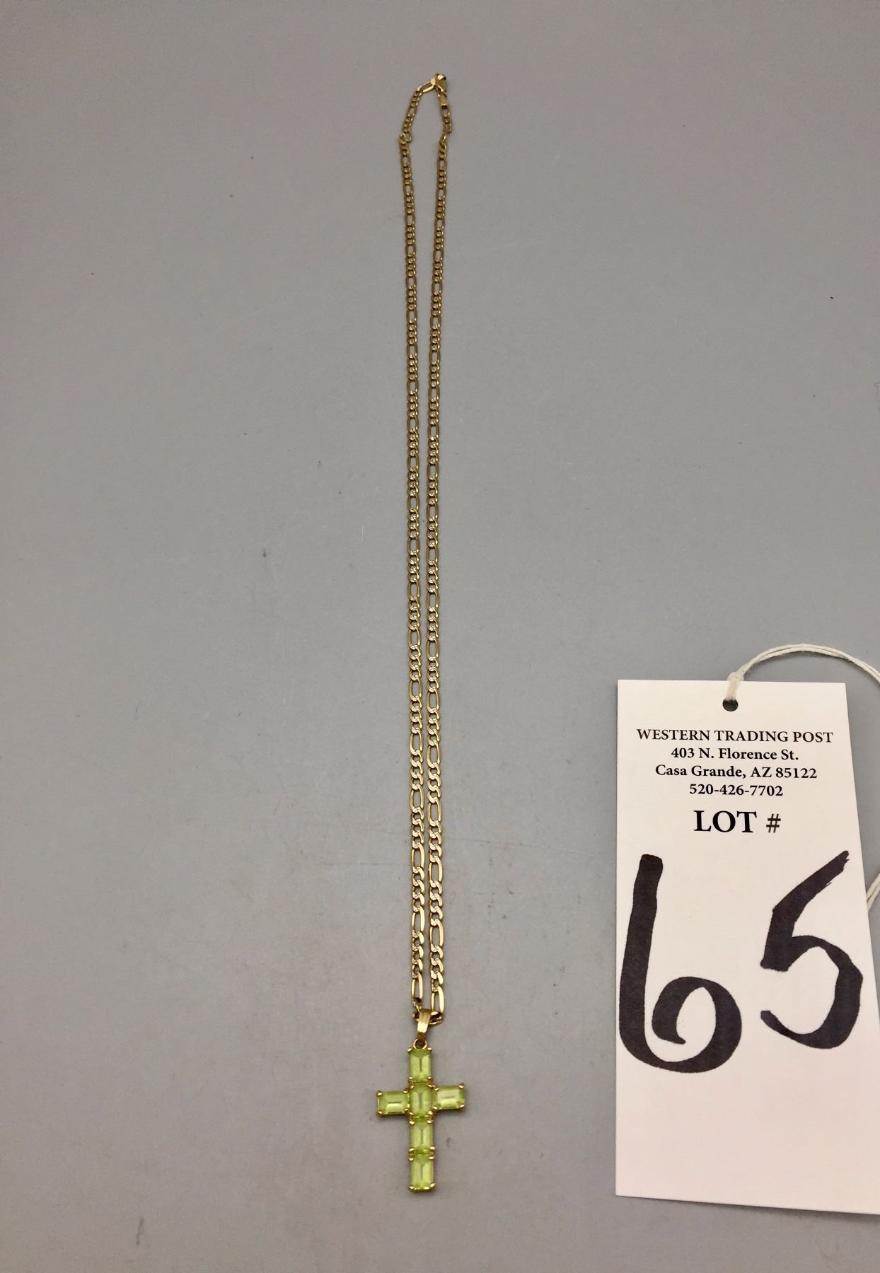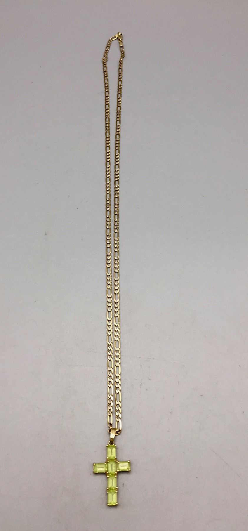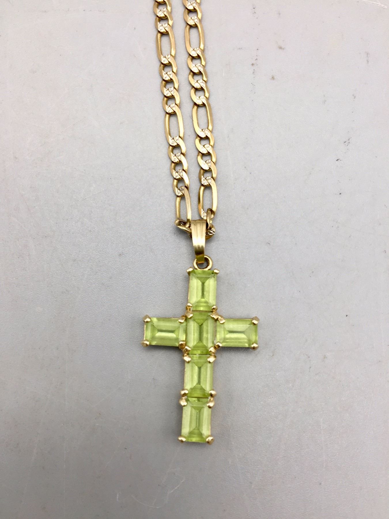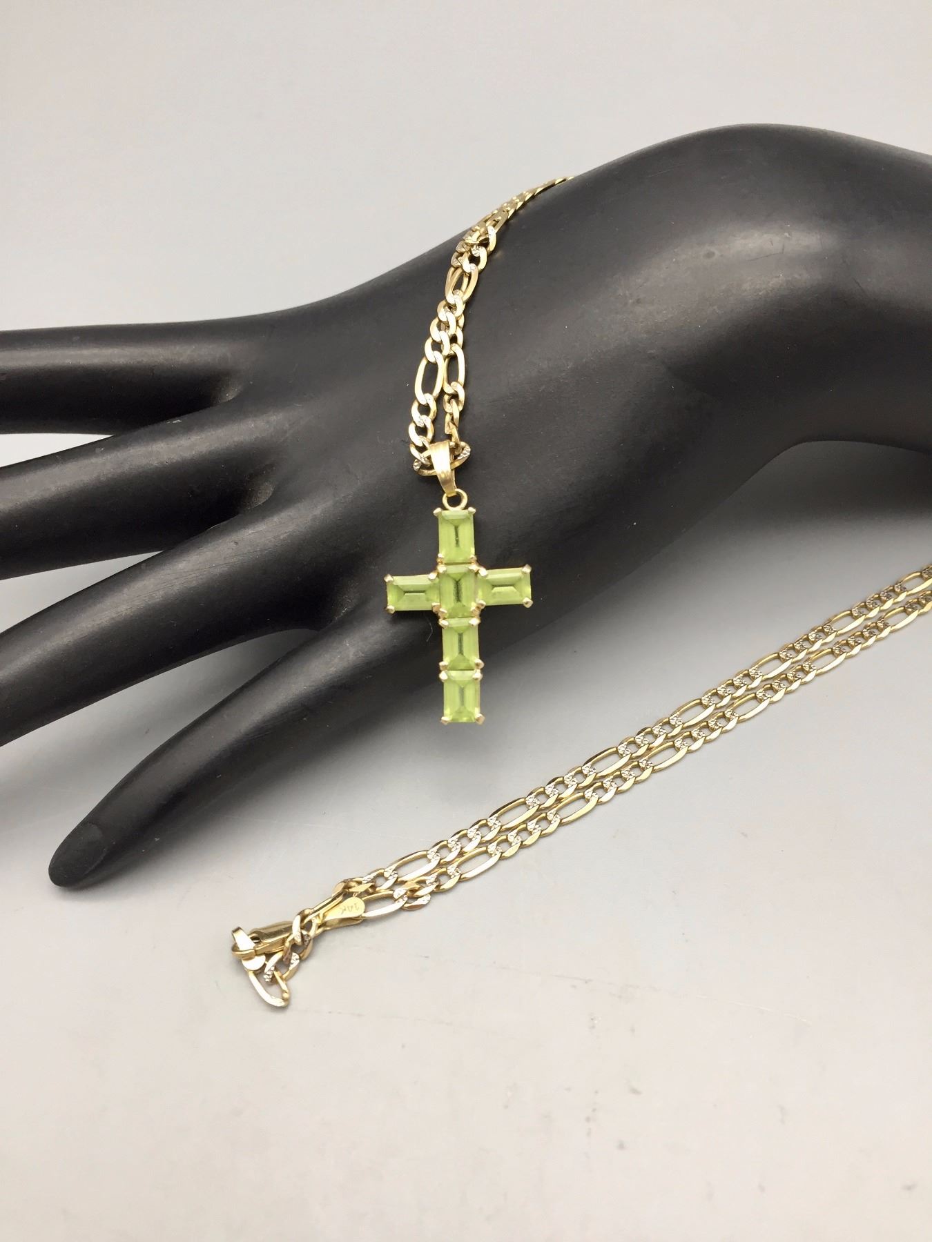 Description: Peridot cross pendant on gold herringbone chain. Items are 14K gold. Maker: Unknown. Approx. Age: Fairly modern. Size: Chain 23". Pendant 5/8" w to 1”. Weighs 11.5 g. Condition: Good for its age, normal wear expected. Please look closely at the pictures - they are an important part of our description. Shipping: There will be a $5 handling / packaging fee for shipping this lot. The actual cost of postage will be added on top of that.