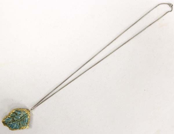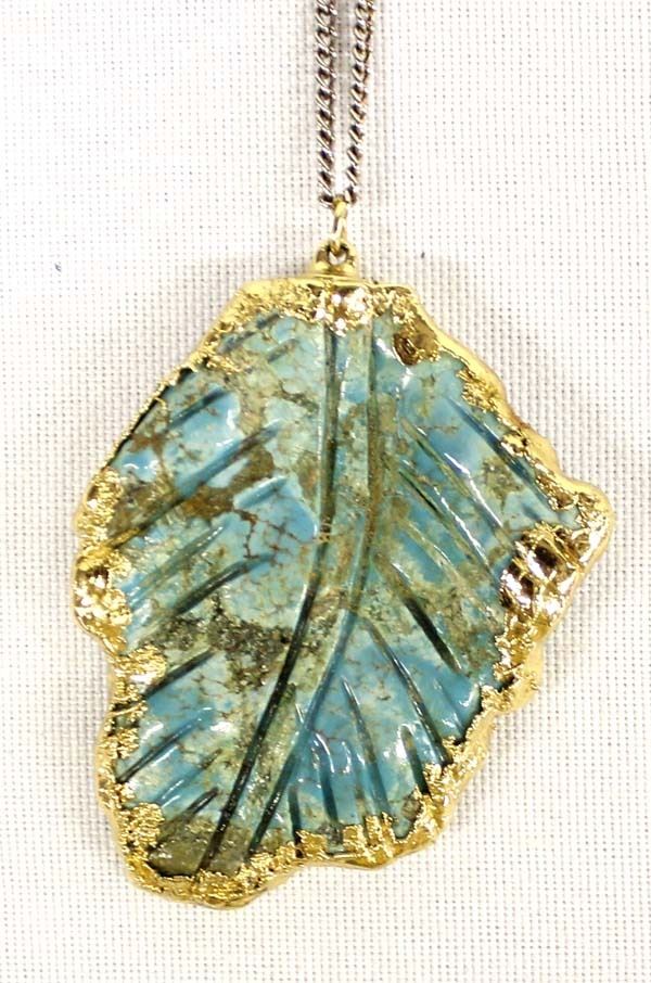 Gold Gilt Carved Turquoise Leaf Necklace, pendant measures 1.5'' x 2'', beautiful turquoise